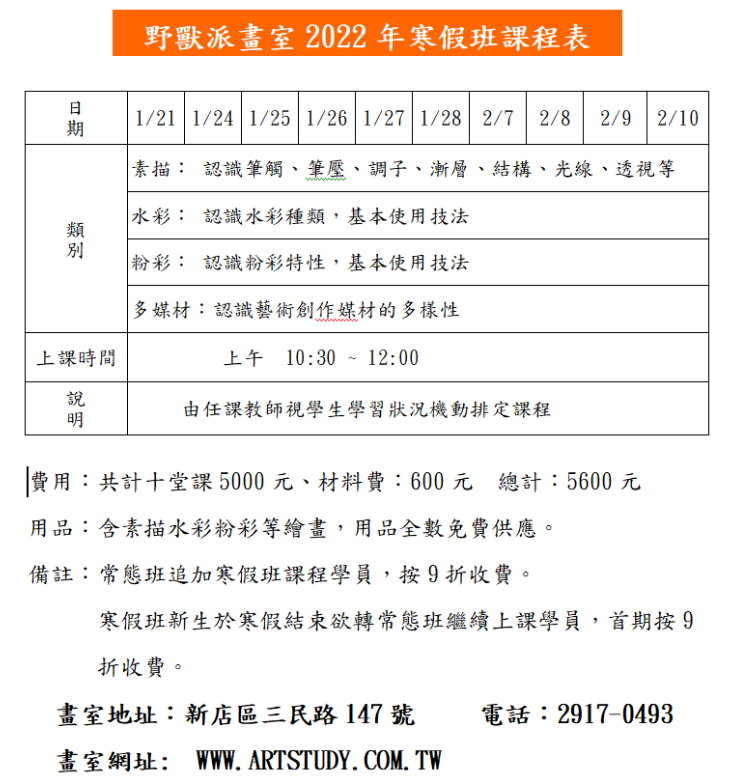 2022年寒假班課程表